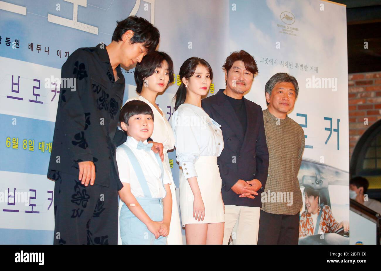 L R Gang Dong Won Lim Seung Soo Lee Joo Young Lee Ji Eun Iu Song Kang Ho Hirokazu Kore Eda June 2 2022 Cast Members And Japanese Film Director Hirokazu Kore Eda Pose At A Photo Call Before